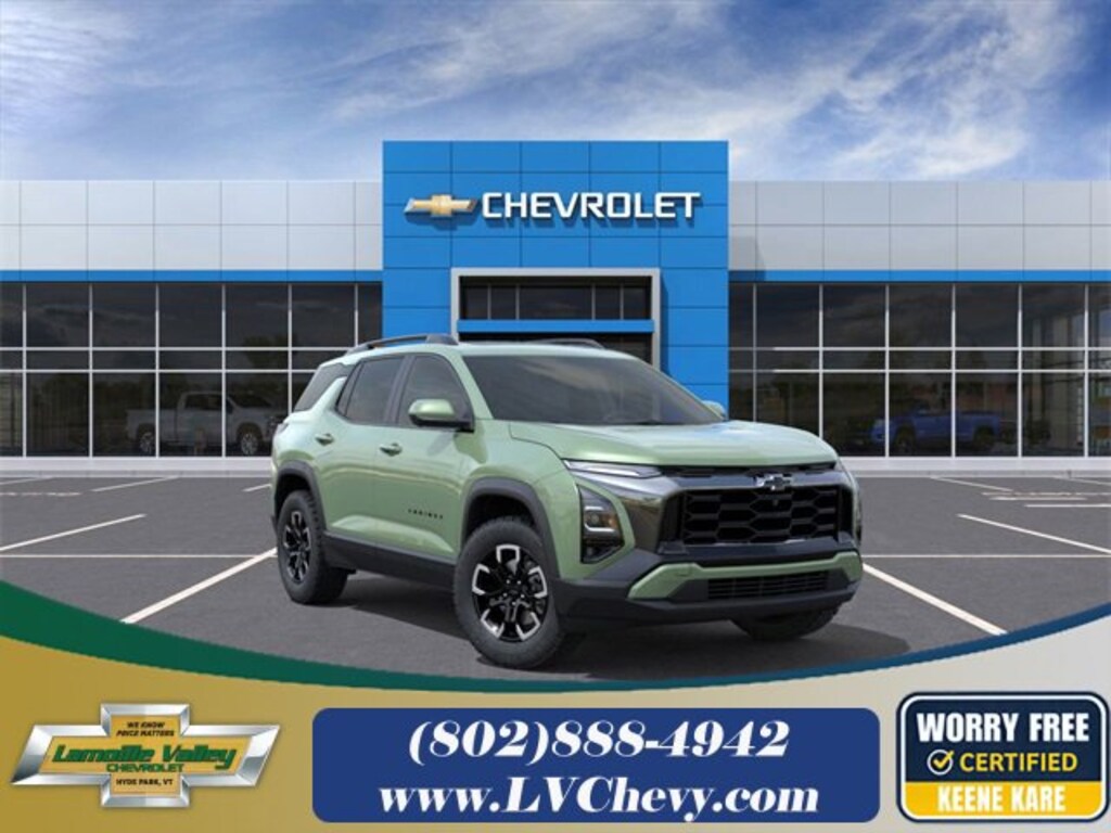 Cacti Green 2026 Chevrolet Equinox ACTIV AWD 8-Speed Automatic 1.5L DOHC AWD.Lamoille Valley Chevrolet is proud to present you with another True Market Priced Vehicle. This 2026 Chevrolet Equinox ACTIV is loaded with the following Factory Options: AWD Preferred Equipment Group KDZ, Safety & Technology Package (Front Fog Lamps, HD Surround Vision, Rear Pedestrian Alert, and Traffic Sign Recognition), AWD, 2-Way Power Driver Lumbar Control Seat Adjuster, 3.47 Final Drive Axle Ratio, 4-Wheel Disc Brakes, 6 Speakers, ABS brakes, Air Conditioning, Alloy wheels, AM/FM radio: SiriusXM, Auto High-beam Headlights, Automatic temperature control, Brake assist, Bumpers: body-color, Compass, Delay-off headlights, Driver 8-Way Power Seat Adjuster, Driver door bin, Driver vanity mirror, Dual front impact airbags, Dual front side impact airbags, Electronic Stability Control, Emergency communication system: OnStar and Chevrolet connected services capable, Four wheel independent suspension, Front anti-roll bar, Front Bucket Seats, Front Center Armrest, Front dual zone A/C, Front Passenger 4-Way Manual Seat Adjuster, Front reading lights, Fully automatic headlights, Garage door transmitter, Heated door mirrors, Heated Driver & Front Passenger Seats, Heated front seats, Heated steering wheel, Illuminated entry, Low tire pressure warning, Navigation System, Occupant sensing airbag, Outside temperature display, Overhead airbag, Overhead console, Panic alarm, Passenger door bin, Passenger vanity mirror, Power door mirrors, Power driver seat, Power Dual Glass Panoramic Sliding Sunroof, Power Liftgate, Power steering, Power windows, Premium audio system: Chevrolet Infotainment 3 Plus, Radio data system, Radio: 11.3 Diagonal Advanced Color LCD Display, Rain sensing wipers, Rear anti-roll bar, Rear Camera Mirror Washer, Rear reading lights, Rear seat center armrest, Rear window defroster, Rear window wiper, Remote keyless entry, Security system, SiriusXM w/360L Trial Subscription, Speed control, Speed-sensing steering, Split folding rear seat, Spoiler, Steering wheel mounted audio controls, Sueded Microfiber Seat Trim, Tachometer, Telescoping steering wheel, Tilt steering wheel, Traction control, Trip computer, Variably intermittent wipers, and Wheels: 17 Dark Android Machined-Face Aluminum!! Recent Arrival! 24/29 City/Highway MPGAt Lamoille Valley Chevrolet, we're more than just a car dealership in Hyde Park VT. We're also members of the greater Stowe, Burlington MA and Barre VT communities, who work and live here just like you, and we want only what's best for our neighbors. We strive to support community initiatives and events, and we're committed to delivering the best customer service around, from new Chevrolet sales, to used vehicles, to finance and service. We provide the best of the best to all our customers.Whatever you're shopping for, our sales team is here to ensure a seamless experience throughout every step of the vehicle-buying process. Know exactly what you want? Great! We'll help you secure the best financing for your budget. Not sure where to start? No problem! We can help you narrow down your options, so you can select the best Chevrolet for your needs.When you stop by our showroom in Hyde Park VT, you'll get to speak with our team of professionals who are ready to guide you through every aspect of buying or owning a Chevrolet model. Now that you know everything that we can do for you near Stowe, Burlington MA and Barre VT, come in and speak with us about what you need for your Chevrolet Silverado 1500, Trax, Silverado 2500HD, Equinox and Bolt EV.Visit us at: 868 VT RT 15E HYDE PARK, VT 05655.
