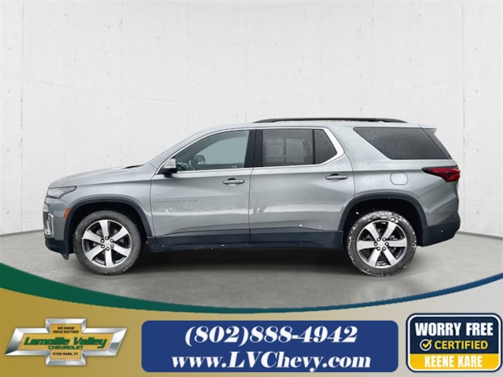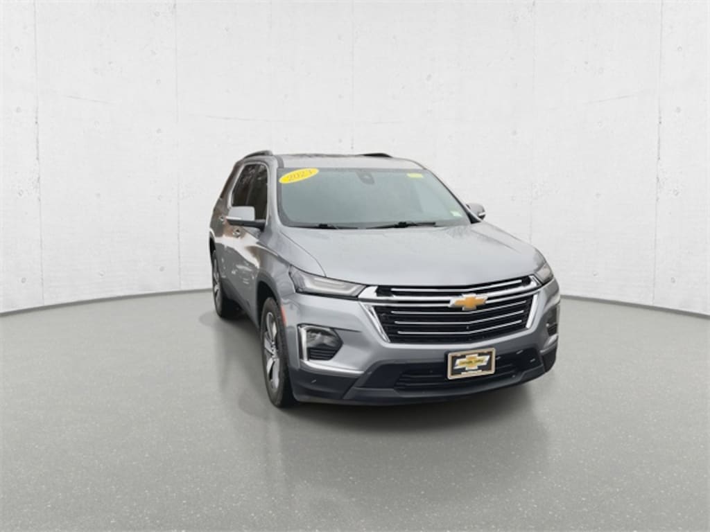Lamoille Valley Chevrolet is proud to present you with another True Market Priced Pre-Owned Vehicle. This 2023 Chevrolet Traverse LT Leather is loaded with the following Factory Options: AWD Front License Plate Bracket Mounting Package, LT Premium Package (120-Volt Power Outlet, Adaptive Cruise Control, Bose Premium 10-Speaker Audio System Feature, Enhanced Automatic Emergency Braking, Outside Heated Power Adjustable Mirrors, Radio: Chevrolet Infotainment 3 Plus System w/Navi, Upper Active Aero Shutters, and Wheels: 20" Machined Face Aluminum), Preferred Equipment Group 3LT (Heated Driver & Front Passenger Seats), Rear Camera Mirror Package (HD Surround Vision, Rear Camera Mirror Washer, and Rear Pedestrian Alert), Trailering Equipment (Heavy-Duty Cooling System, Hitch Guidance w/Hitch View, and Trailering Assist Guidelines), AWD, 3.49 Axle Ratio, 3rd row seats: split-bench, 4-Wheel Disc Brakes, 6 Speakers, 6-Speaker Audio System Feature, 6-Way Power Front Passenger Seat, 8-Way Power Driver Seat Adjuster, ABS brakes, Air Conditioning, Alloy wheels, AM/FM radio: SiriusXM with 360L, Apple CarPlay/Android Auto, Auto High-beam Headlights, Automatic temperature control, Black Roof Rails, Brake assist, Bumpers: body-color, Compass, Delay-off headlights, Driver door bin, Driver vanity mirror, Dual front impact airbags, Dual front side impact airbags, Dual SkyScape 2-Panel Power Sunroof, Electronic Stability Control, Emergency communication system, Exterior Parking Camera Rear, Four wheel independent suspension, Front anti-roll bar, Front Bucket Seats, Front Center Armrest, Front dual zone A/C, Front Passenger 2-Way Power Lumbar, Front reading lights, Fully automatic headlights, Garage door transmitter, Heated door mirrors, Heated front seats, Heated steering wheel, Illuminated entry, Leather steering wheel, Leather-Appointed Seat Trim, Low tire pressure warning, Not Equipped w/Rear Park Assist (060), Occupant sensing airbag, Outside temperature display, Overhead airbag, Overhead console, Panic alarm, Passenger door bin, Passenger vanity mirror, Power door mirrors, Power Driver Lumbar Control, Power driver seat, Power Liftgate, Power passenger seat, Power steering, Power windows, Premium audio system: Chevrolet Infotainment 3 Plus, Radio data system, Radio: Chevrolet Infotainment 3 Plus System, Rear air conditioning, Rear anti-roll bar, Rear reading lights, Rear window defroster, Rear window wiper, Remote keyless entry, Security system, SiriusXM w/360L, Speed control, Speed-sensing ste